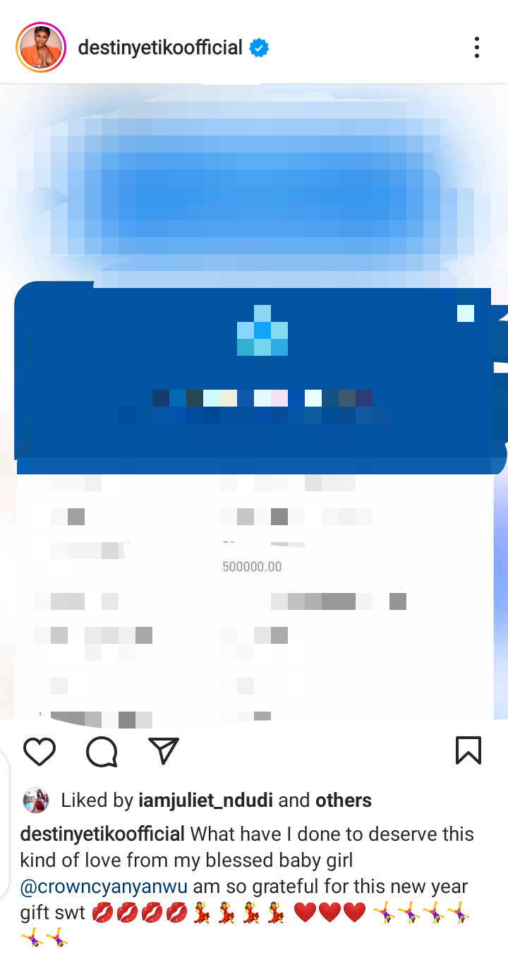 Destiny Etiko aka Dramadoll Unlimited has taken to her official social media page to shower praises on her colleague, Crowncy Anyanwu for gifting her N500,000 as a new year gift.