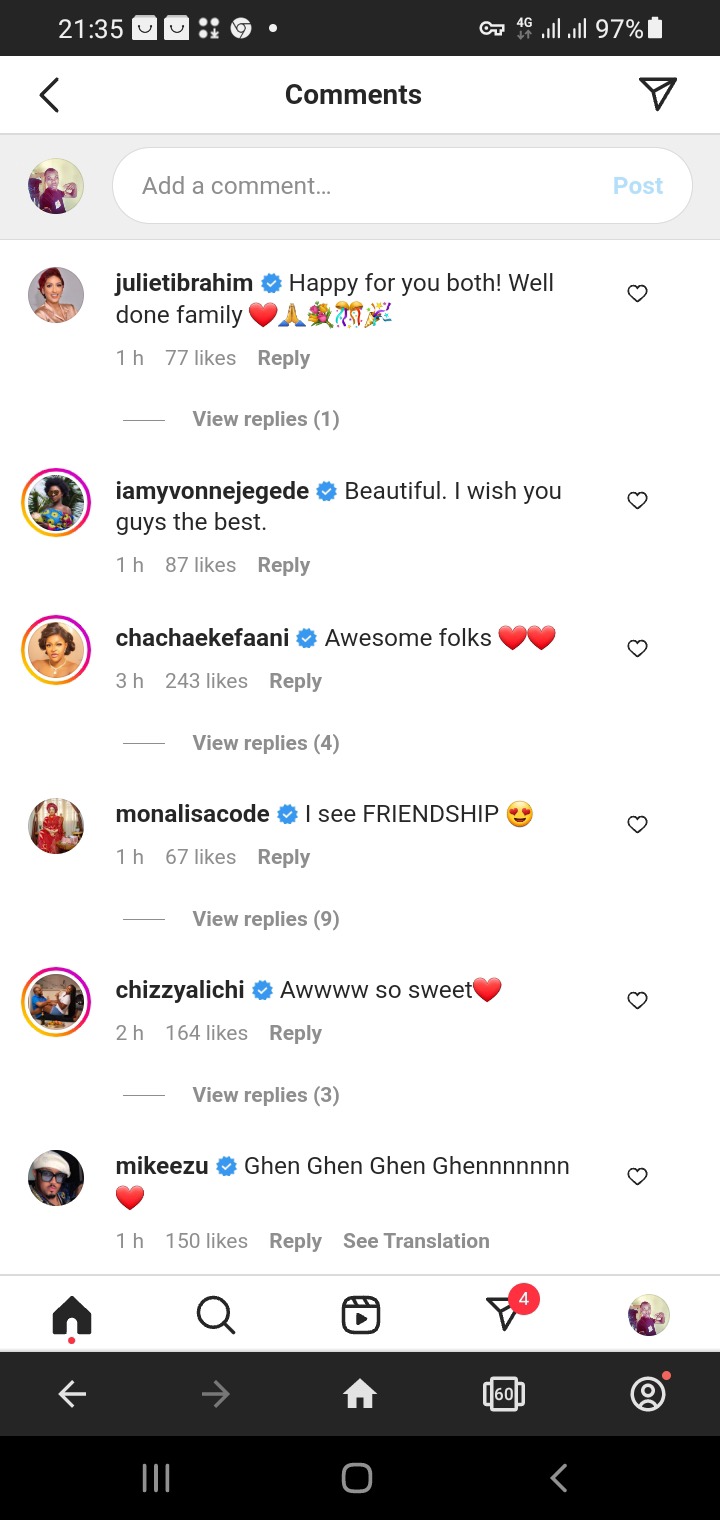 However, many of the lovers’ colleagues in the industry have stormed their pages to congratulate them, and celebrate their love. Celebrities like the beautiful Ghanian actress, Juliet Ibrahim, Mike Ezu, Chioma Akpotha, Mary Lazarus among others have expressed their happiness for the two lovers, complimenting how great they looked together, and even prayed for their relationship.